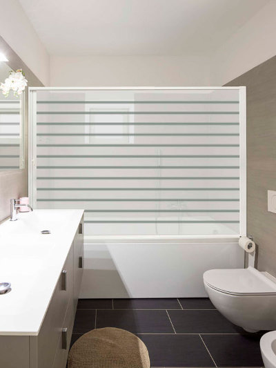 Mampara enrollable para bañeras con lámina blanca decorada con líneas horizontales